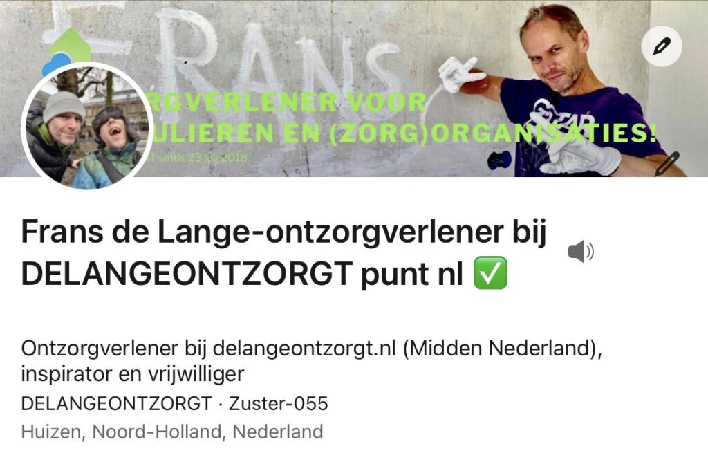 Vanaf juni 2020 heb ik een dag per week gewerkt voor een man met Vasculaire Dementie en Diabetes. Hij woonde in hartje Haarlem. Hij was volledig afhankelijk van zorg. Ik heb hem en zijn vrouw ondersteund in de zorg en alles wat verder nodig was. Gedurende anderhalf jaar tot aan zijn overlijden kwam ik elke dinsdag bij hen thuis. We hebben mooie, verdrietige moment beleefd.